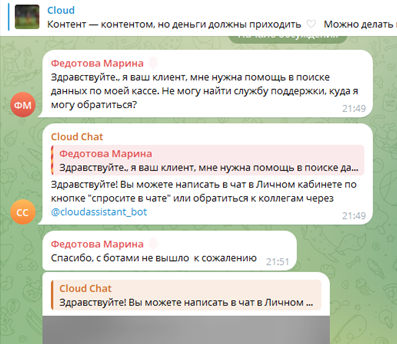 В Телеграме Cloudpayments комментарии пользователей, по большей части, касаются условий обслуживания. Хотя некоторые подписчики обращаются за помощью к админу, так как саппорт не отвечает или же автоматический бот не может решить проблему. Данная особенность свидетельствует о низком качестве обслуживания партнеров.