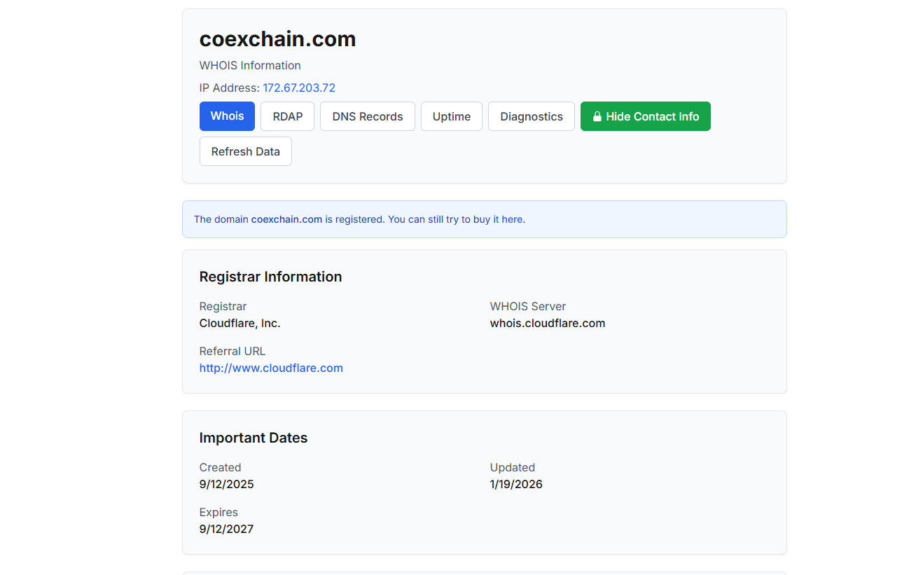 По данным Whois, домен проекта был зарегистрирован осенью 2025 года через регистратор Cloudflare. Информация о местоположении серверов и владельцах скрыта настройками приватности, но по данным, которые указаны на CoExchain com, обменник находится под управлением компании «Кэшбанк». На страницах сервиса опубликованы политика конфиденциальности, правила AML и пользовательское соглашение. Формально площадка обращается только к физлицам старше 18 лет и сразу предупреждает о необходимости подтверждать личность.