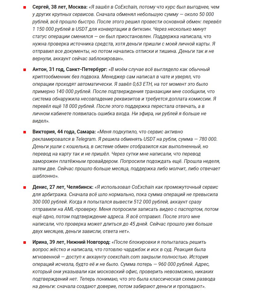 Тем не менее на независимых площадках люди жалуются на длинные проверки после сделок на $2,000 и выше. В отзывах рассказывают, что поддержка CoExchain com перестала отвечать после того, как запросила дополнительные документы. Встречаются истории о заморозке средств на несколько недель и просьбах оплатить дополнительную комиссию перед возвратом.