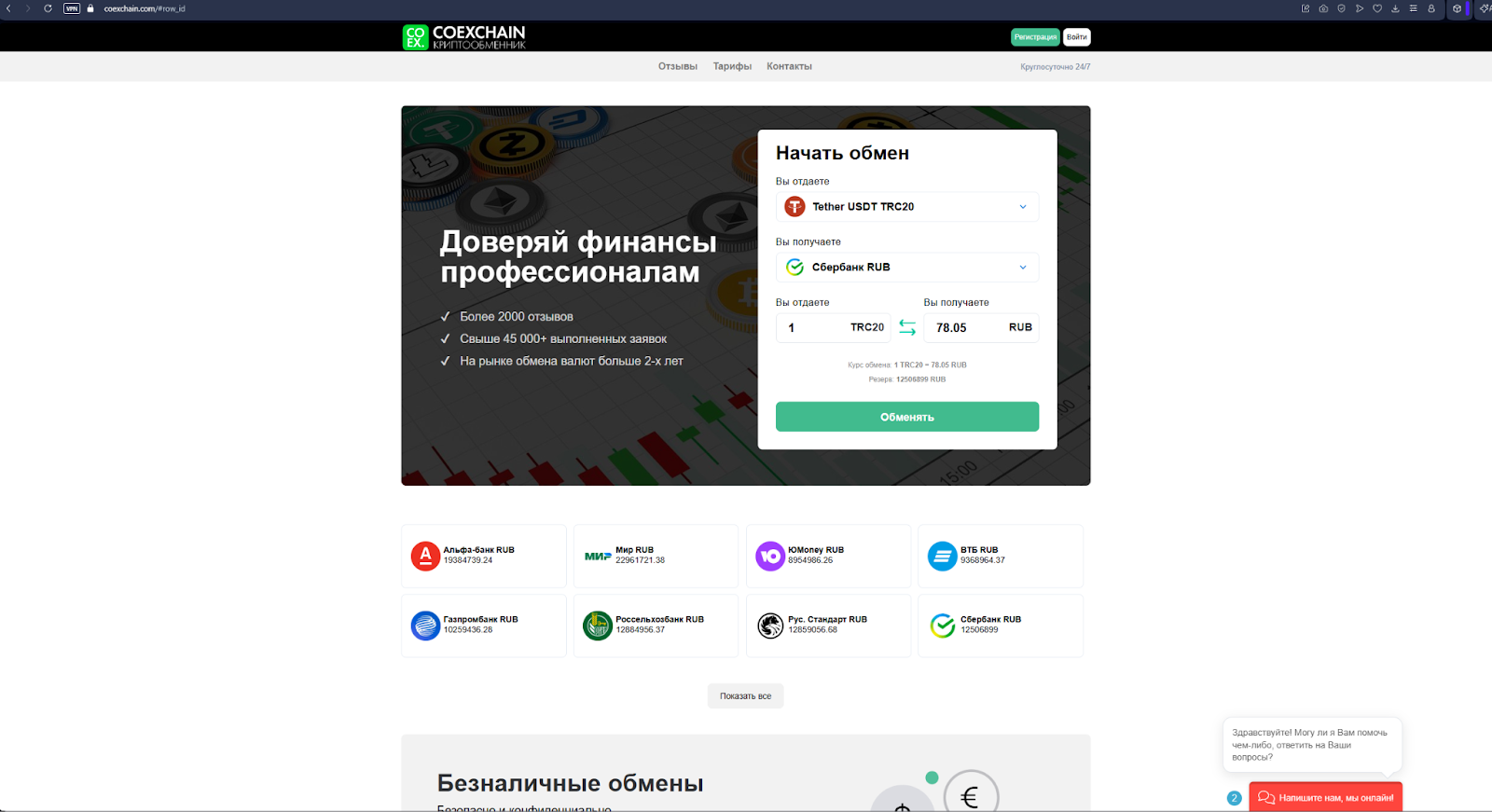 На главной странице «КоЭксчейн» клиентам обещают быстрый обмен, понятный интерфейс и круглосуточную поддержку. Пользователь выбирает направление обмена, вводит сумму, указывает реквизиты и подтверждает заявку. Деньги зачисляются после проверки, а курс фиксируется на момент создания транзакции. К преимуществам CoExchain com относит большой список направлений обмена, адекватные комиссии и отсутствие скрытых платежей. Также есть функция мгновенного фиксирования курса, что позволяет избежать неожиданного проседания рынка во время мультивалютной операции.