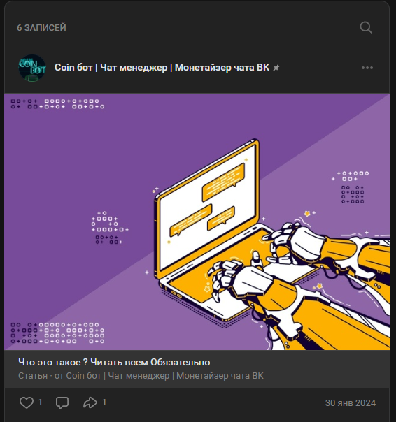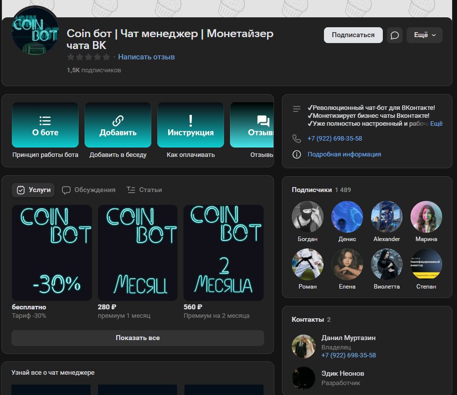 Coin Bot – это ВК-бот для монетизации чатов с объявлениями: например, бесед по поиску вакансий или продажам. Программа не позволяет обычным пользователям свободно оставлять сообщения, блокируя их. Однако участник обсуждения может оплатить “место” через данный софт. Далее в статье постараемся разобраться, насколько данный функционал работает эффективно и безопасно ли вообще использовать сервис.