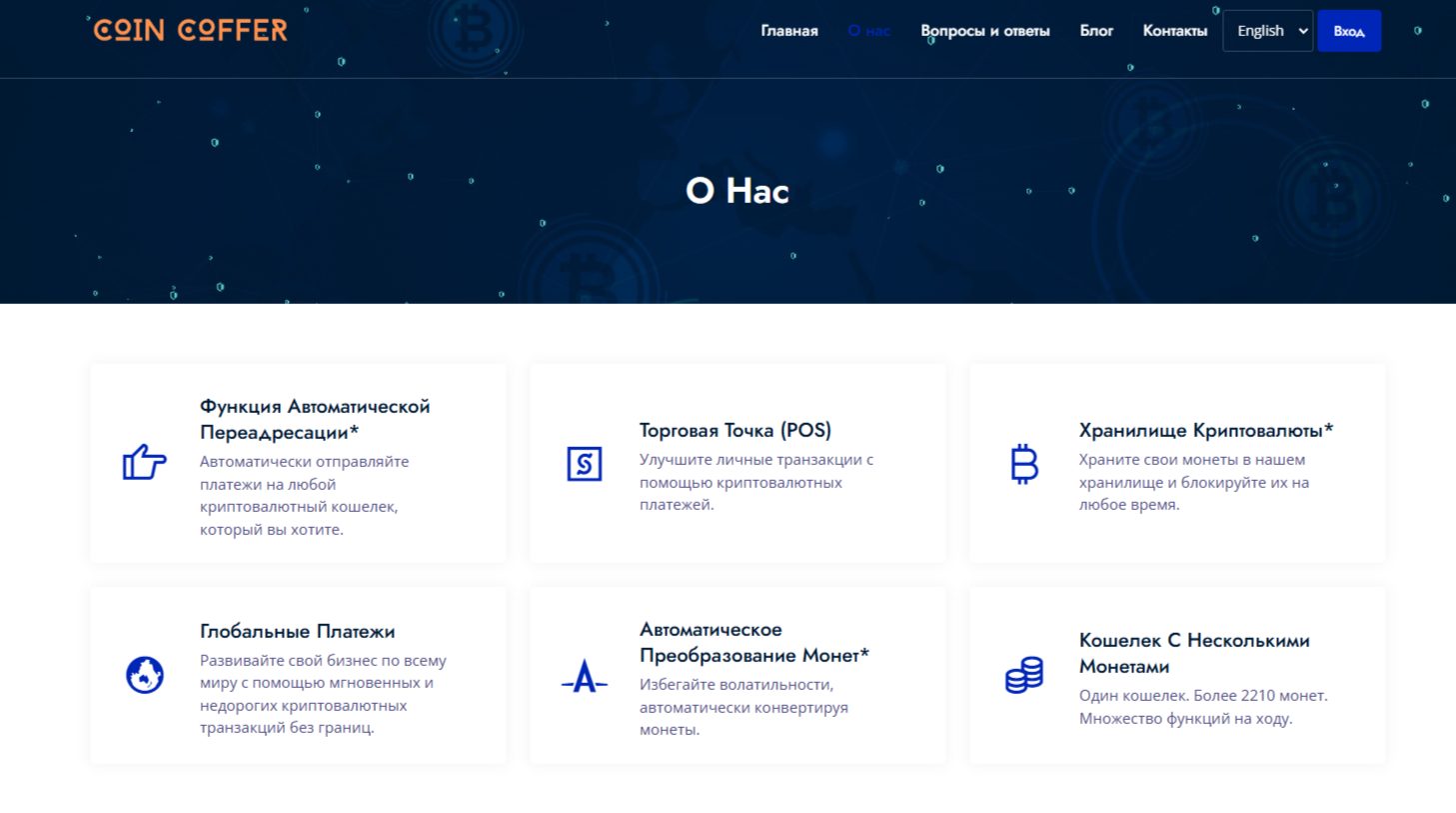 Основу деятельности криптовалютной биржи составляют торговля и обмен 100+ цифровых активов. Какие монеты можно обменять или купить на данной платформе можно узнать после регистрации. На сайте coin coffer org клиентам доступен ряд функций: