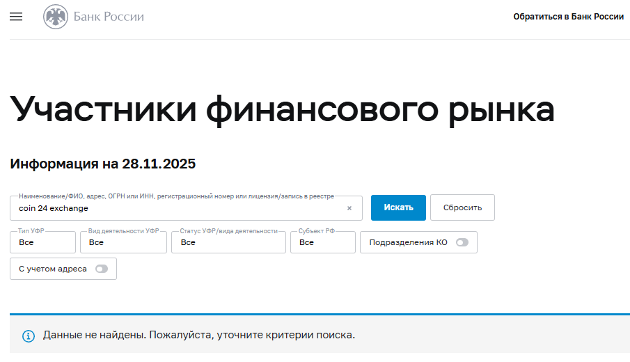 Платформа позиционировала себя криптобиржей. Домен coin24 exchange com зарегистрировали 14 октября 2025 года. До конца ноября сайт закрылся. Проект просуществовал полтора месяца. Такой срок сразу настораживает. Легальные биржи работают годами. Наращивают клиентскую базу постепенно. Здесь картина другая – сайт появился и быстро пропал.