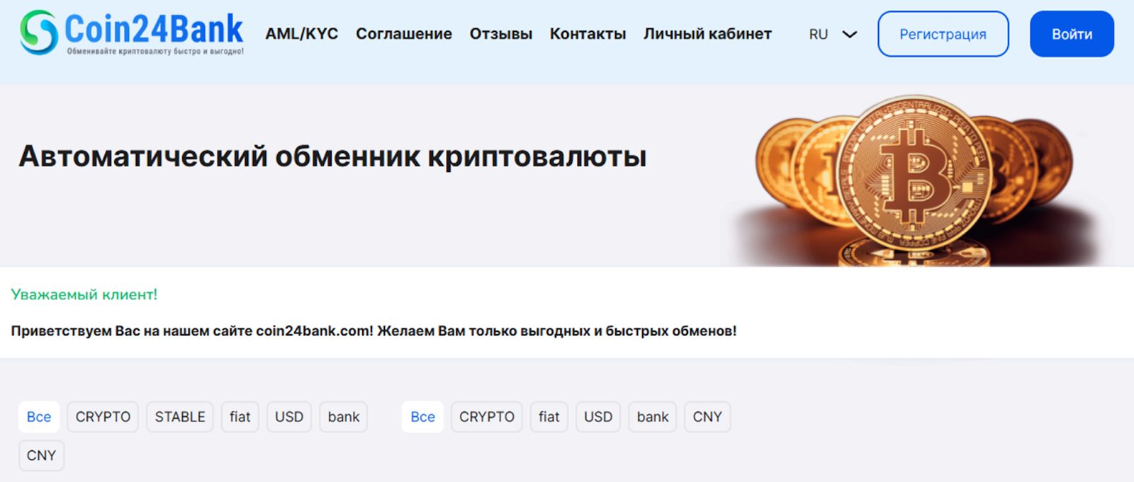 Совершать обмены на Coin24bank com можно в круглосуточном режиме. В перечне доступных монет Биткоины, USDT, XMR, LTC, DASH, ETH, а также фиатные валюты доллары, рубли и юани. Переводы в фиате можно совершать со счета физлица или юрлица.
