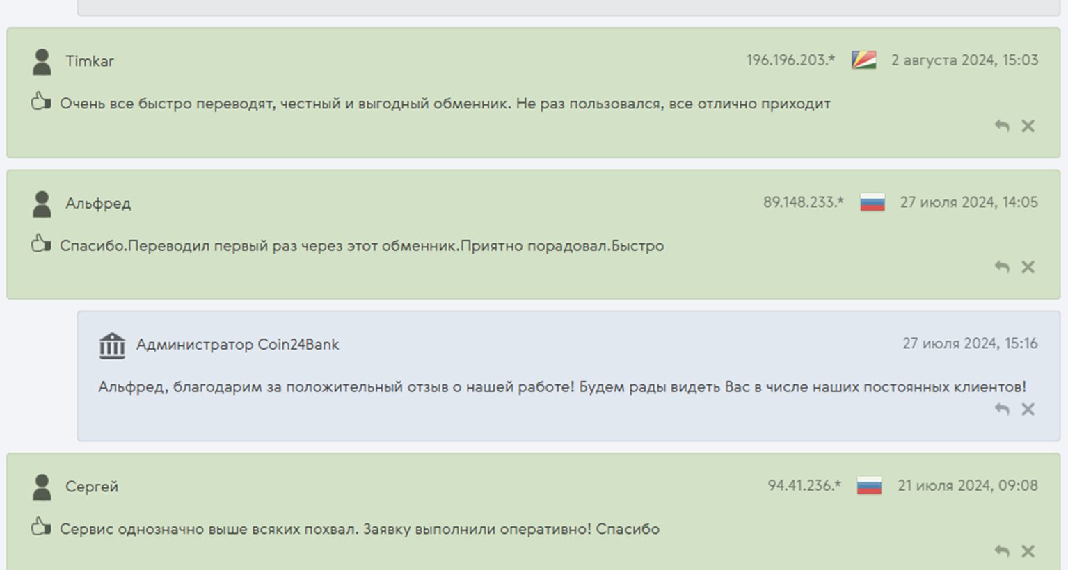 Почти все отзывы на Coin24bank com положительные, причем на всех мониторингах и независимых форумах. Пользователи отмечают быстрые обмены, хорошую работу саппорта и удобный интерфейс сайта.