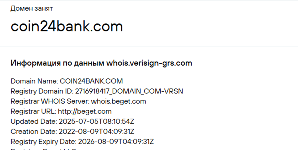 Главными залогами безопасности «Коин24банк» является сотрудничество с мониторингами и долгий срок работы. Мы проверили срок действия домена, сайт действительно был запущен в 2022 году.