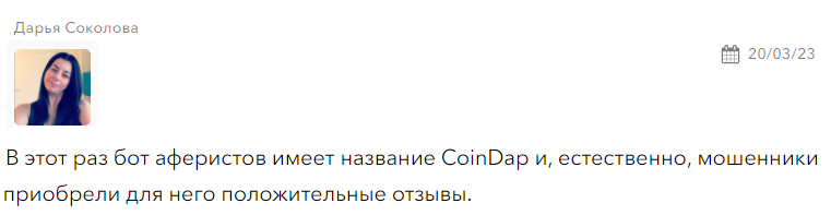 - о скам-боте Coindap пользователи в интернете оставляют отрицательные отзывы.