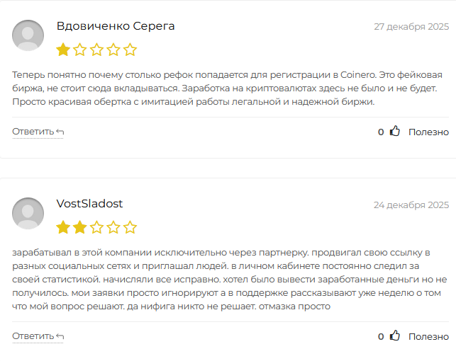 В своих отзывах Coinero Cc люди пишут, что внести деньги сюда можно, а вывести их не получается. При попытке сделать это появляются разные проблемы: бесконечное ожидание, блокировки, игнорирование или обвинения от техподдержки.