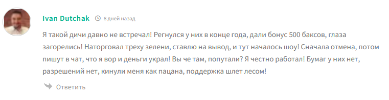 Трейдеры тоже подчеркивают проблемы, выявленные в ходе обзора: отсутствие регистрации и документов, нестыковки в датах, недавняя регистрация и так далее. А один из пользователей написал, что ему не выплатили даже реферальную награду за привлечение новых клиентов.