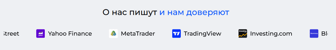 Сразу под приветственным блоком на веб-сайте — бегущая строка с крупными брендами: Investing Com, Bloomberg, Yahoo, MetaTrader и другими. Сообщается, что их издания пишут про Коинеро и доверяют бирже. Однако по факту на официальных сайтах упомянутых проектов нет упоминаний сервиса — второе противоречие от разработчиков.