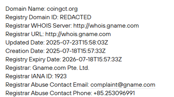 Домен Coingct Org создан 18 июля 2025 года. Для биржи срок существования в полгода совсем маленький. Все серьезные площадки с надежной репутацией функционируют на рынке более пяти лет.