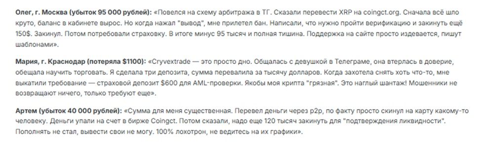 Отзывы о Coingct Org свидетельствуют, что «эксперты» нашли их в социальных сетях и предложили заработать. Отмечено, что с пользователем работают до момента получения от него максимальной суммы средств. Это может быть основной депозит, страховка, какие-то другие сборы. После заявки на вывод средств аккаунт блокируют, и техподдержка перестает выходить на связь.