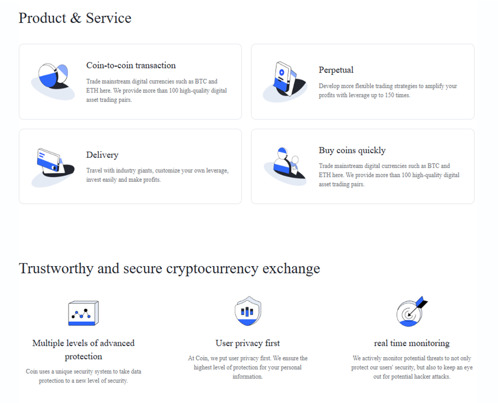Разработчики представили «Коингкт» как криптовалютную биржу с онлайн курсами обмена на самые востребованные направления. Информации о деятельности минимум, большинство разделов недоступны, в том числе условия сотрудничества, регистрационных данных нет, лицензии не представлены, владельцы не известны, тарифов и лимитов нет. Можно понять, что к перечню услуг относятся: