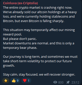 17 ноября появилось сообщение о падении крипты. Команда заявила о продаже альткоинов в убыток. Перешли на стейблкоины с биткоином. Предупредили о влиянии на пул наград.