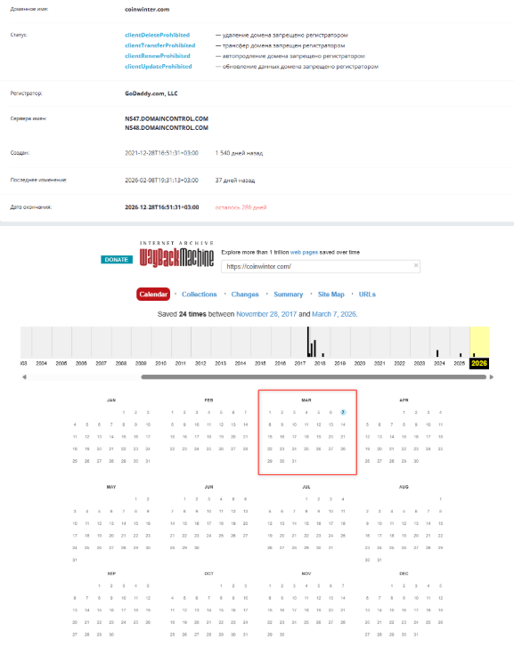 Все остальные ссылки или не работают, или связаны с другими сайтами, которые раньше пользовались этим адресом. Последнее изменение в рамках домена произошло в начале февраля 2026 года, поэтому мы сделали вывод о существовании проекта в течение месяца, а к середине марта 2026-го CoinWinter уже закрылся.