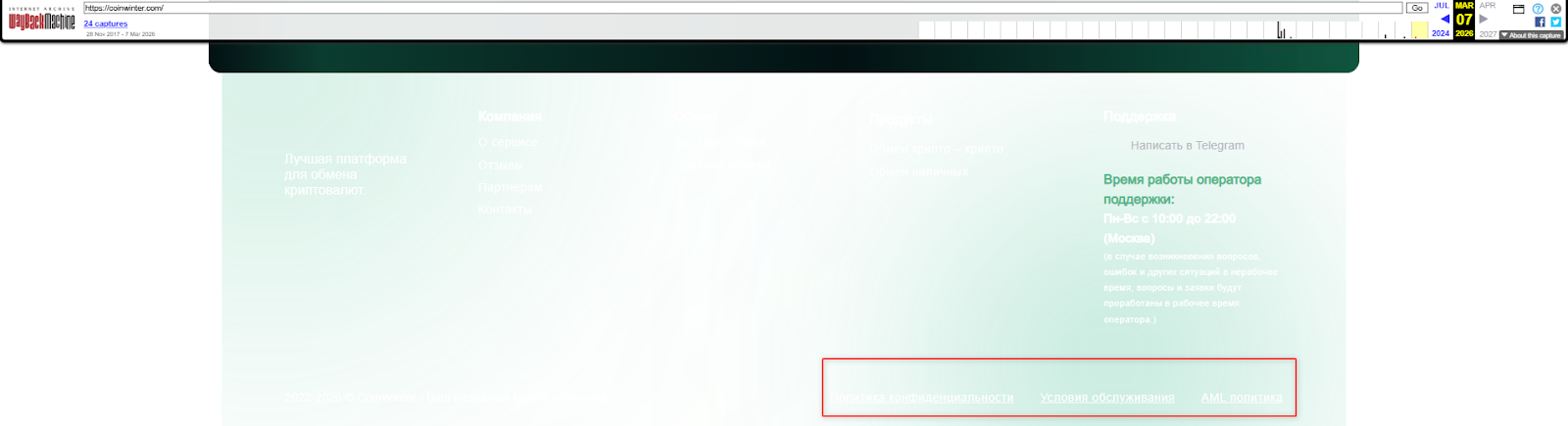 Мы проанализировали сохраненные проиндексированные страницы обменника CoinWinter, но не нашли ни одного упоминания юридического лица. Скорее всего, как и другие подобные сервисы, платформа не была зарегистрирована и работала без какой-либо лицензии.