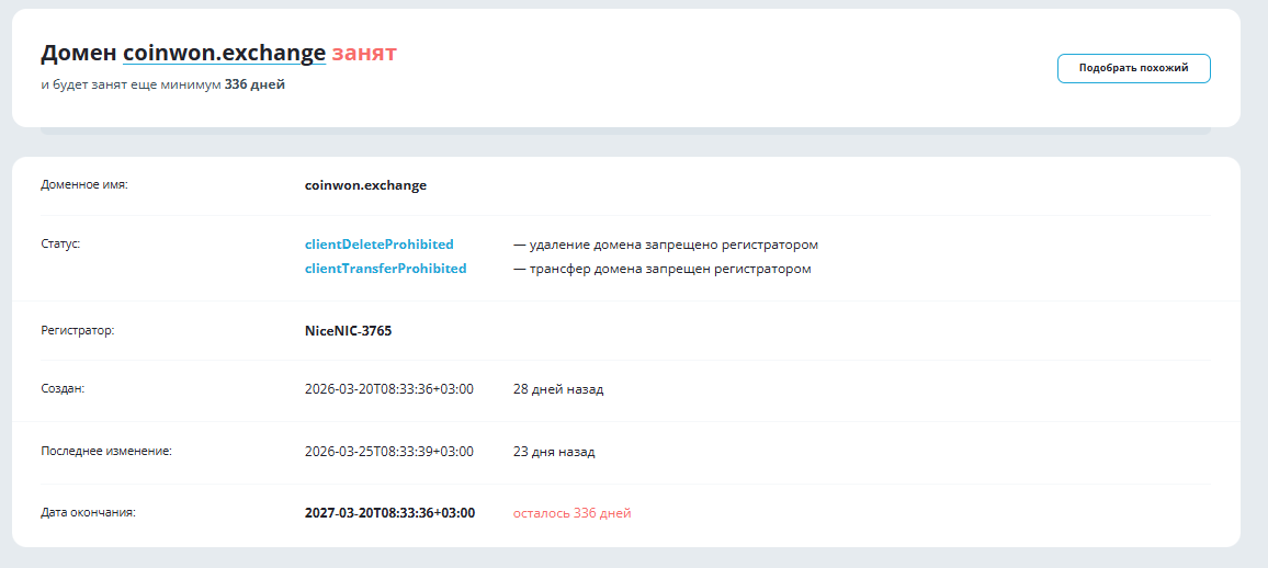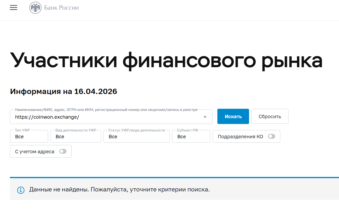 Биржа CoinWon существует в условиях информационного вакуума, ведь на текущий момент (апрель 2026 года) проекту исполнилось всего 28 дней, что в финансовом мире практически ничего. Отсутствие разветвленной сети брендов и единый адрес регистрации указывают на то, что сервис еще не прошел проверку реальным рынком.