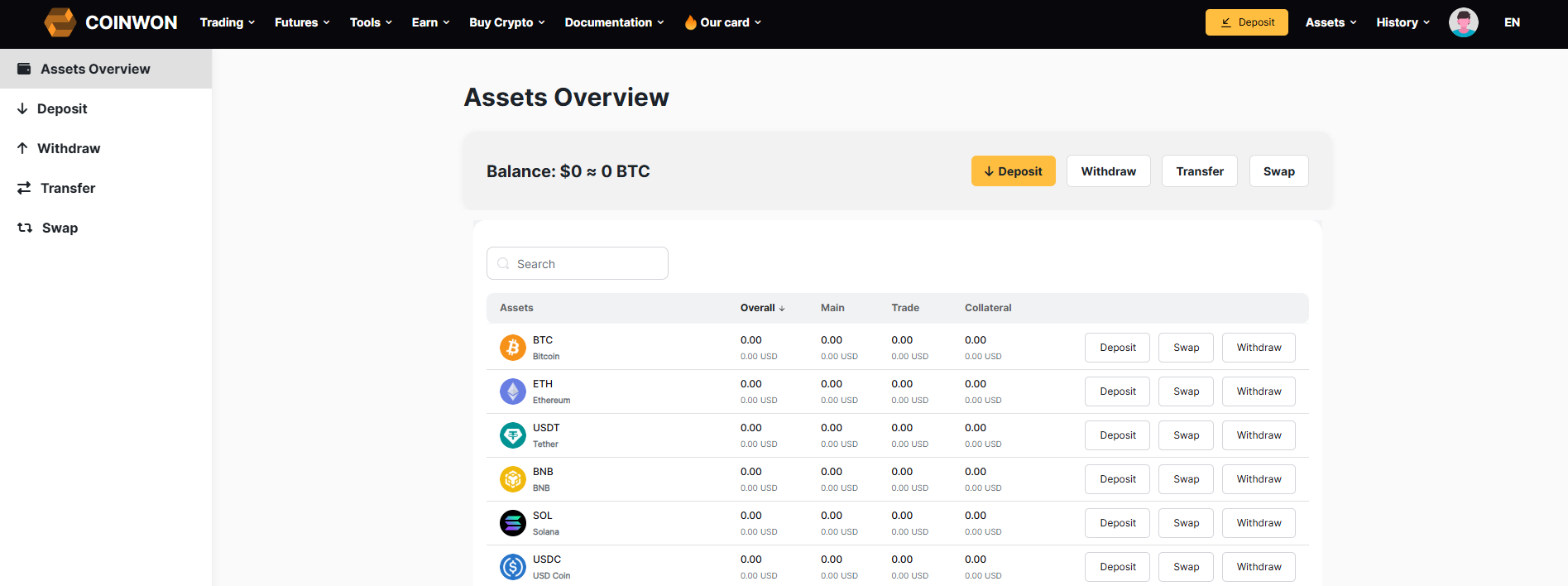 При подготовке разоблачения на биржу CoinWon exchange, мы решили зарегистрироваться на сайте, для чего потребовался только адрес электронной почты. Пополнить баланс счета пользователь может только в криптовалюте, таким же методом производится вывод средств на сторонний кошелек.