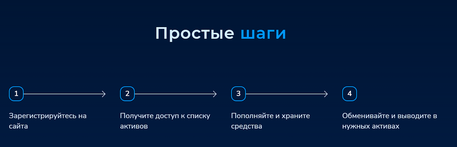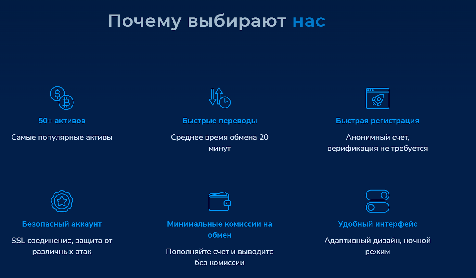 Среднее время обмена между активами составляет 20 минут. Пополнение счета и вывод заявлены как операции без комиссии. Регистрация проходит быстро и не требует предоставления документов для верификации. Это позволяет создать анонимный счет без идентификации личности.