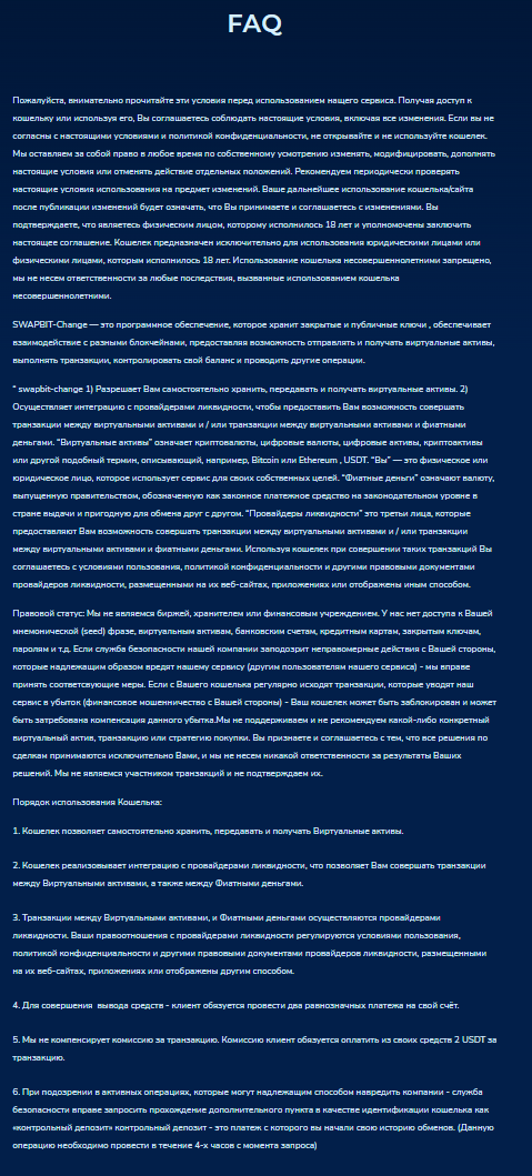 В разделе FAQ несколько раз упоминается название SWAPBIT-Change вместо CoinX, что указывает на копирование текста с другого сайта. Проект не имеет лицензий, сертификатов безопасности или аудитов. Контактные данные отсутствуют.