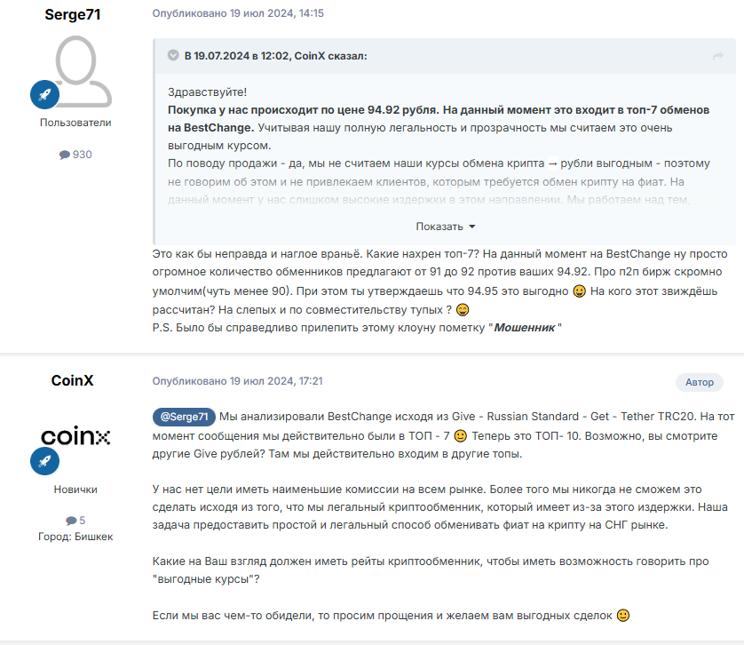 В сети нет ни одного отзыва об обменнике CoinX. Есть только диалог на Битс Медиа, где обсуждают курсы. Там CoinX выставил себя не в лучшем свете.