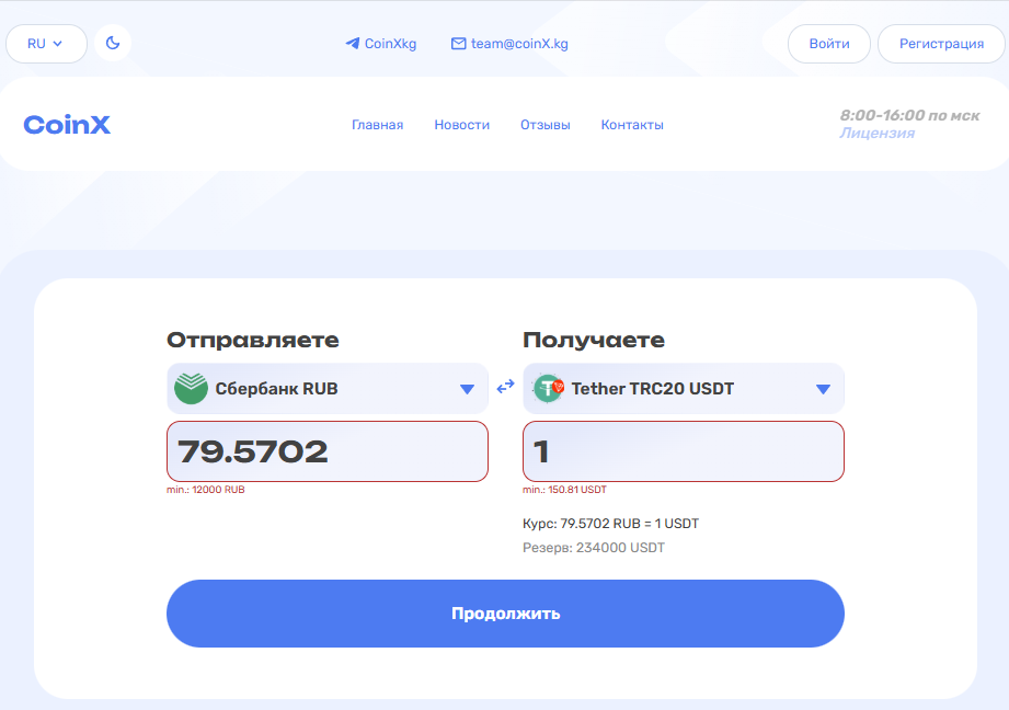 CoinX kg — обменник из Кыргызстана. Через компанию можно отправить деньги из разных банков, но получить только криптовалюту. Проект выглядит немного подозрительно, сайт работает с 2024 года и о нем практически ничего не известно. Администраторы не создали страницы на профильных форумах и агрегаторах.