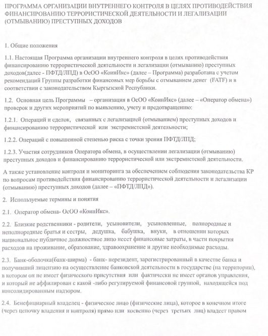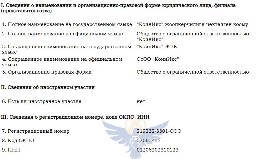 Обменник так и называется: КоинИкс. Работает без иностранного участия. Несмотря на то, что Кыргызстан — не самая серьезная страна в плане экономической безопасности, подобный легальный статус позволяет заявить, что компания относительно честная.