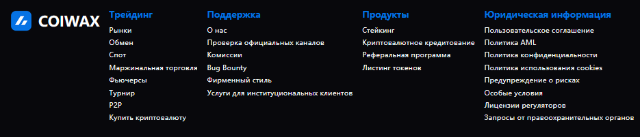Coiwax – криптовалютная биржа, предлагающая удобную торговлю на рынках, работу с фьючерсами, спотами, операциями p2p. Обещает выгодные комиссии и лучшие курсы, соблюдение установленных стандартов безопасности. Но к легальности работы биржи остаются вопросы.
