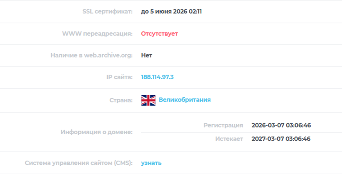 Дорожная карта также не совпадает с результатами проверки истории домена. На сайте сказано, что годом основания стал 2022. Но данные мониторингов свидетельствуют, что площадка была зарегистрирована только 7 марта 2026 через британский IP. Архивных данных нет, активность на сайте крайне низкая.