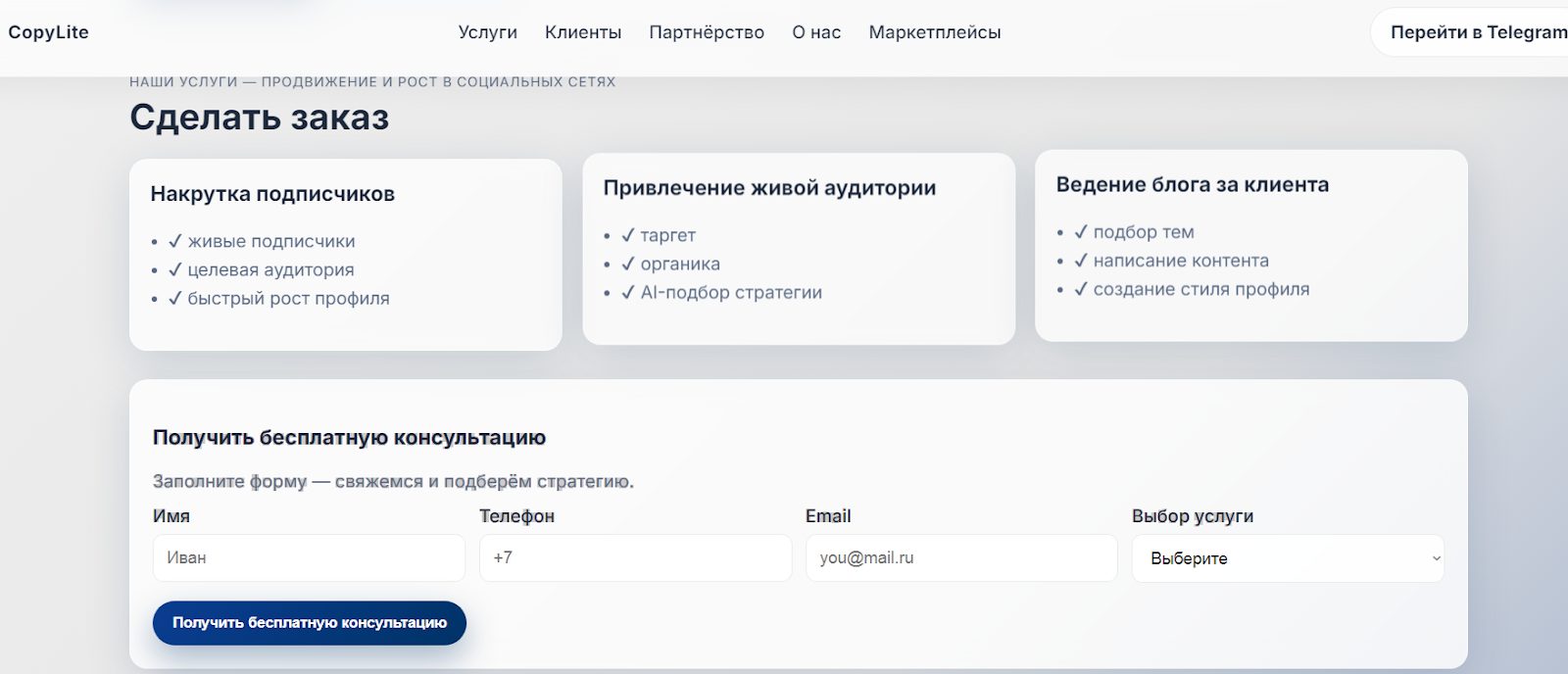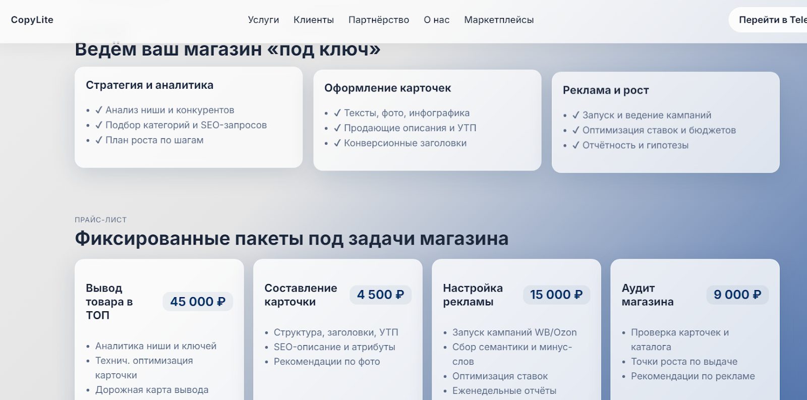 Бот в Телеграмме Copylite отзывы на сторонних ресурсах еще не получил. Данный сервис занимается продвижением и созданием контента, а также ведением магазина на маркетплейсах под ключ, используя ИИ. Клиентам предлагают качественные услуги, а сотрудникам обещают стабильную работу. Далее мы расскажем о деятельности проекта и условиях сотрудничества в деталях.