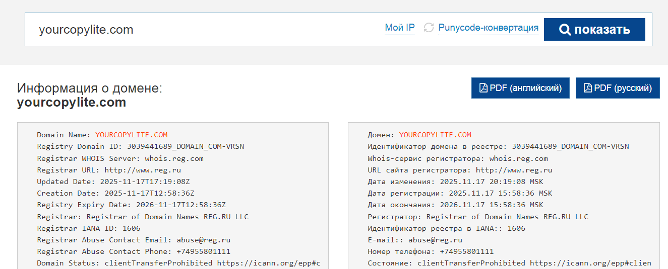 Информации о прочих сотрудниках нет. На площадке нет истории развития сервиса. Домен веб-ресурса yourcopylite com создан в ноябре 2025 года.