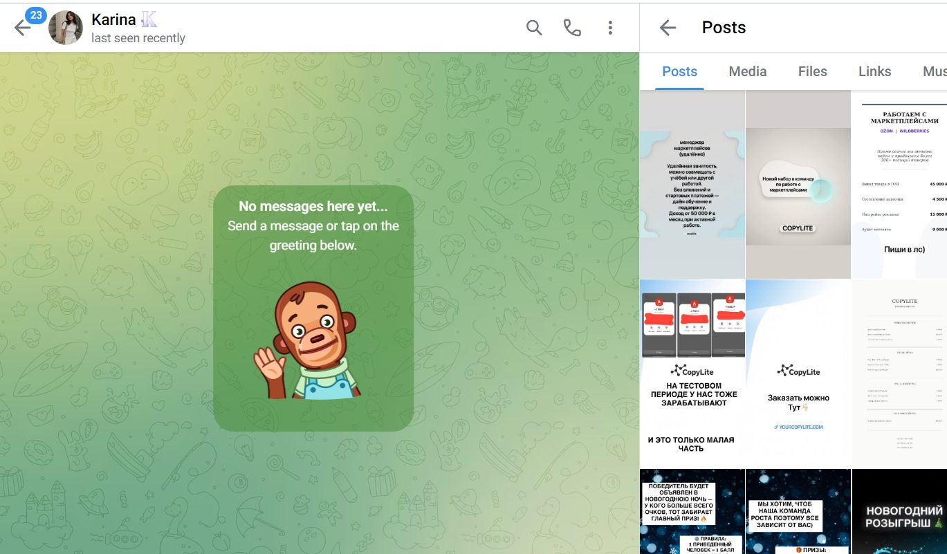 С помощью тг-бота Copylite предлагают пройти собеседование на работу в компанию. Запустив бота, юзеру придет уведомление о необходимости перехода к менеджеру в лс. Как именно происходит процесс собеседования, непонятно. Исходя из сведений в сторис менеджера, начальная оплата может быть от 500 рублей за один написанный пост. В месяц доходность может составлять 70 тыс. рублей. Как уверяют сотрудников, никакие вложения не требуются.