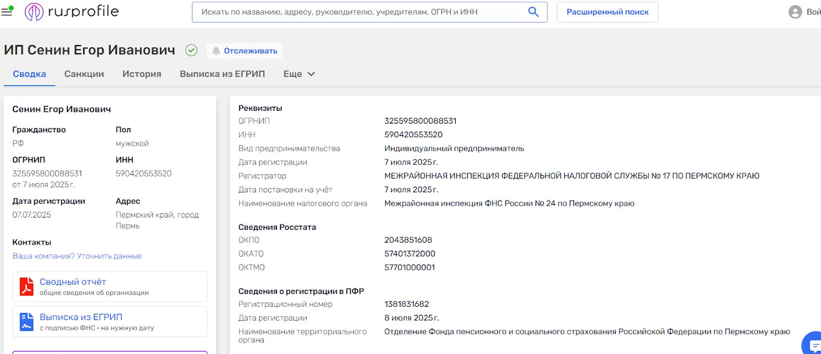 На платформе оставлен номер ИНН, и, судя по нему, ИП выступает Сенин Егор Иванович.