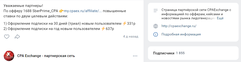 Представители компании занимаются развитием социальных сообществ и администрируют канал в Телеграме. Паблик называется «СпаЭксчендж», и на него подписано 999 пользователей. В ленте группы публикуются актуальные офферы.