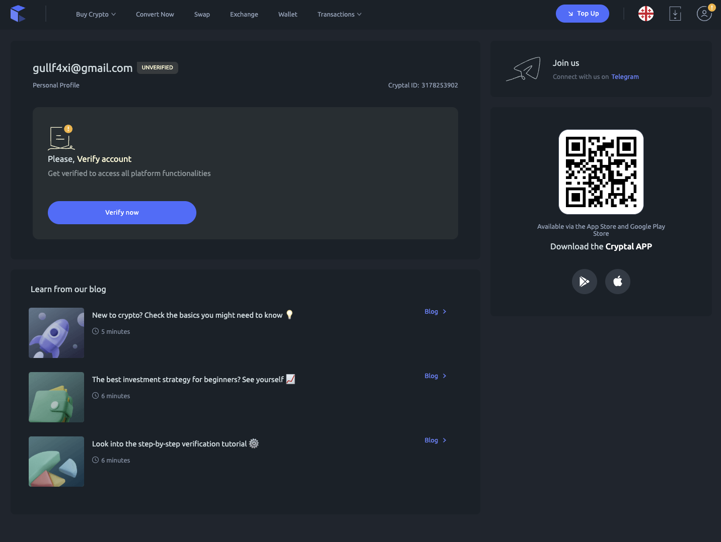 После перехода в личный кабинет пользователь может ознакомиться со всеми возможностями криптобиржи, но для использования большинства из них нужно пройти полноценную верификацию. Для этого на главной странице дашборда требуется нажать на кнопку Verify now.