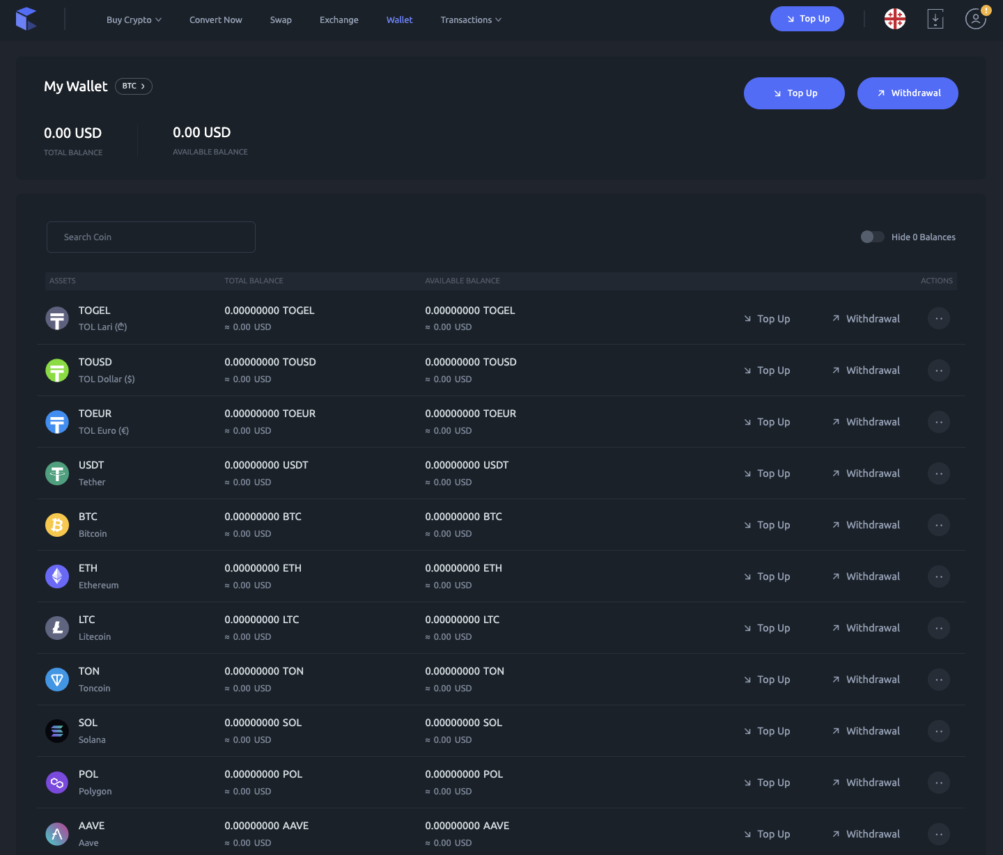 Для пополнения счета в системе нужно сначала перейти в раздел Wallet, ссылка на который находится в главном меню. После этого потребуется нажать на элемент Top Up напротив интересующей криптовалюты и проследовать инструкциям системы. Перед внесением денег необходимо пройти верификацию.