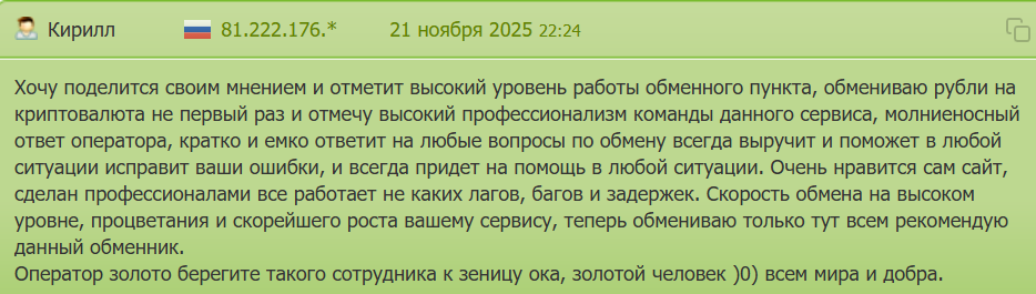Следующий клиент хвалит оперативность работы оператора, отсутствие багов на сайте и задержек с обменом.