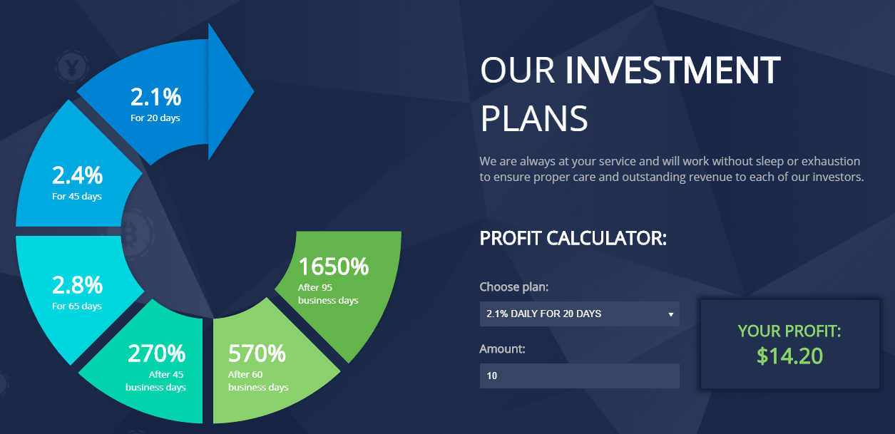 - Обещанная доходность — 2,1% в день, минимальный депозит 10 долларов. Всего 6 тарифных планов. Выплаты в ручном режиме.