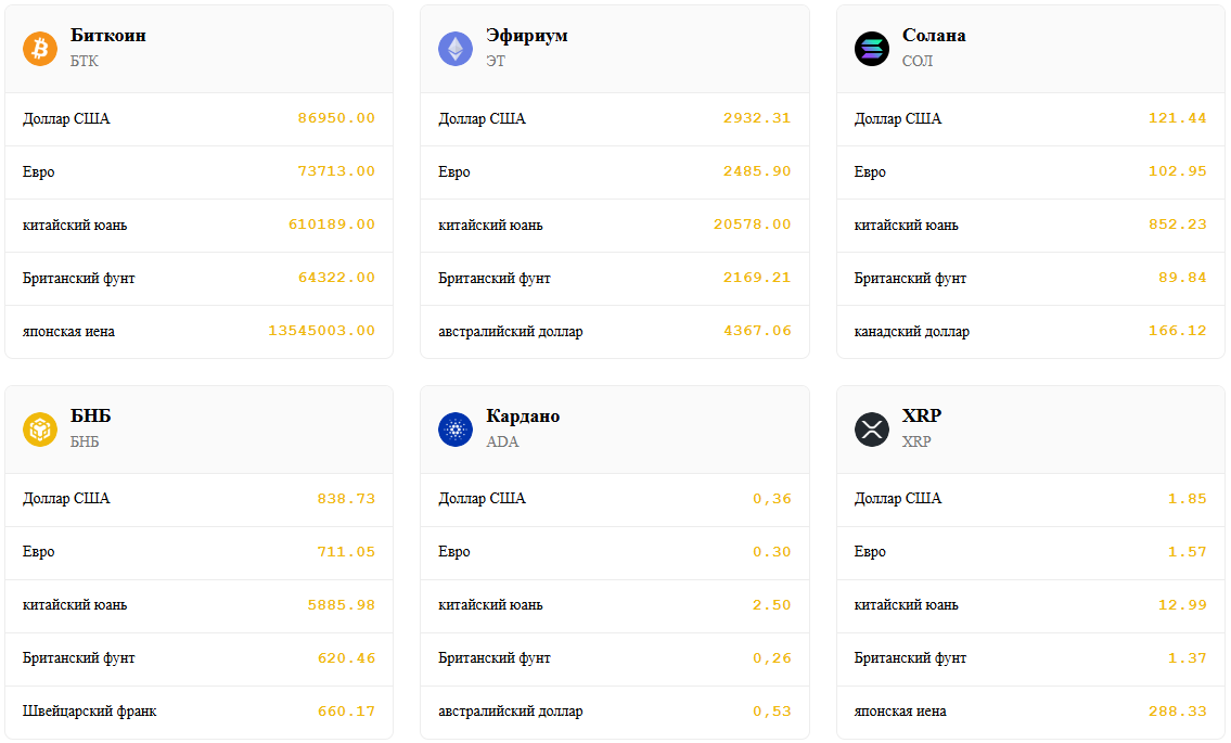 Выбираете криптовалюту из списка. Доступны Bitcoin, Ethereum, Solana, Cardano, XRP и другие монеты. Вторая валюта – фиат: доллары, евро, юани, фунты. Вводите сумму. Система мгновенно выдает результат конвертации по текущему курсу.