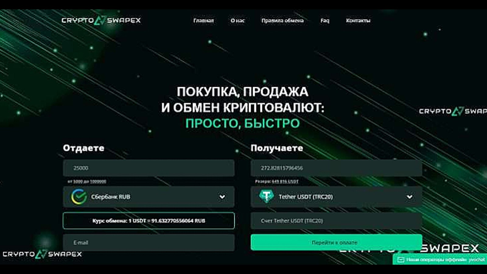 Crypto Swapex предлагает обменивать BTC, Tether USDT TRC20 используя такие методы: Сбербанк, Виза, Мастеркард и другие. Процесс обмена следующий: