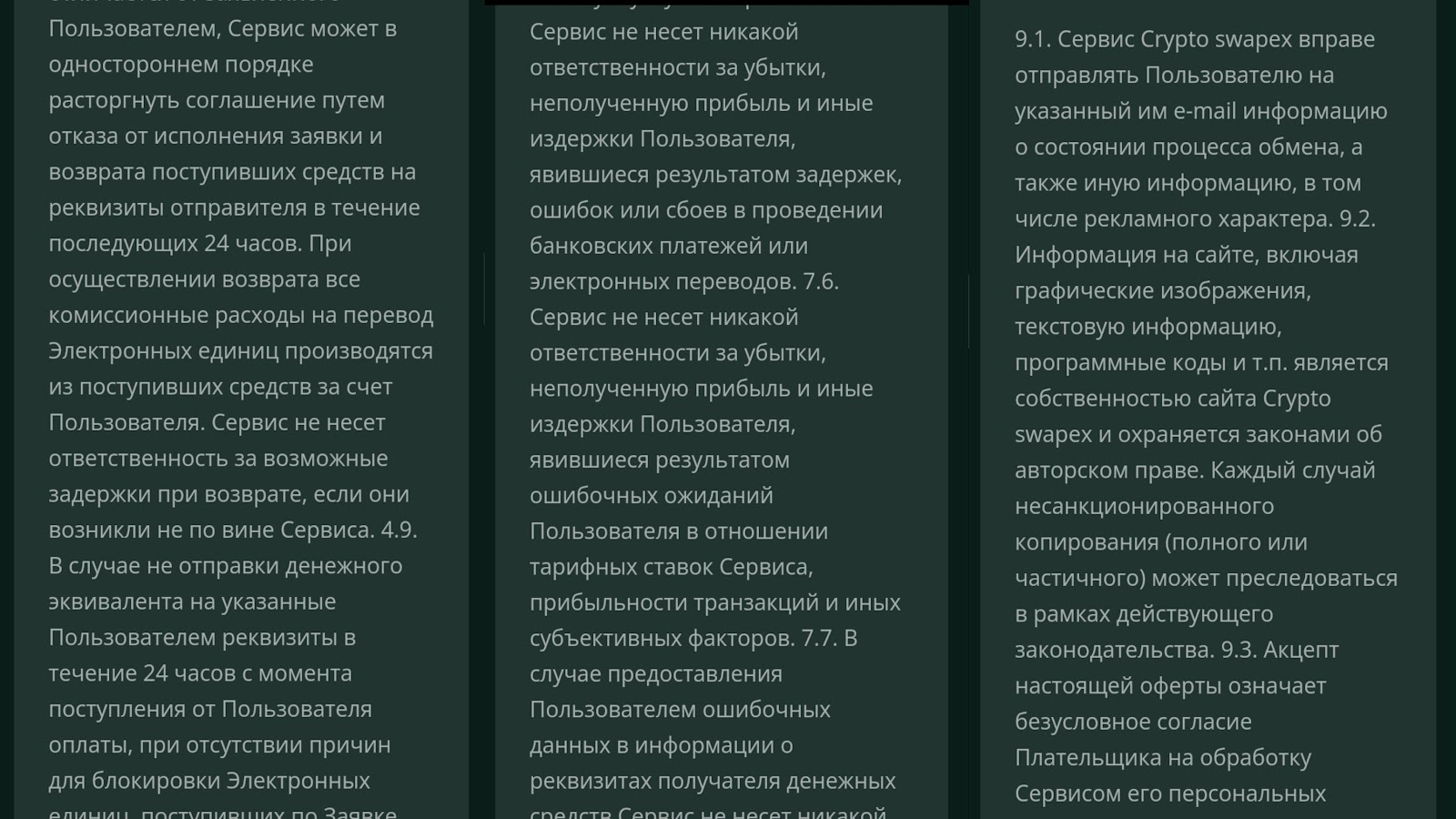 Сервис Крипто Свапекс не получил лицензию на деятельность, и информация о его создателях отсутствует. Из условий работы, CryptoSwapex не берет ответственность за финансовые убытки клиентов, а также имеет право прекратить сотрудничество по своему усмотрению. Из других фактов о платформе мы отметили: