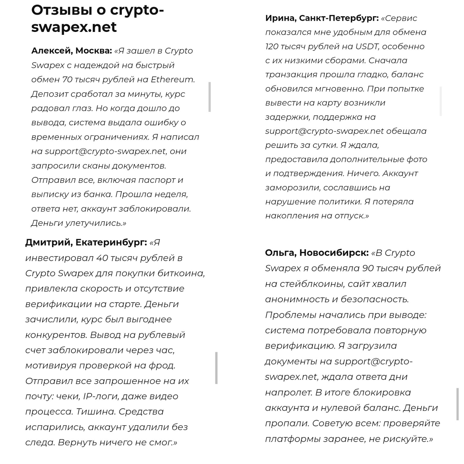 На сторонних платформах встречаются отзывы о том, что во время работы на платформе Crypto Swapex происходят ошибки, и аккаунты часто блокируют.