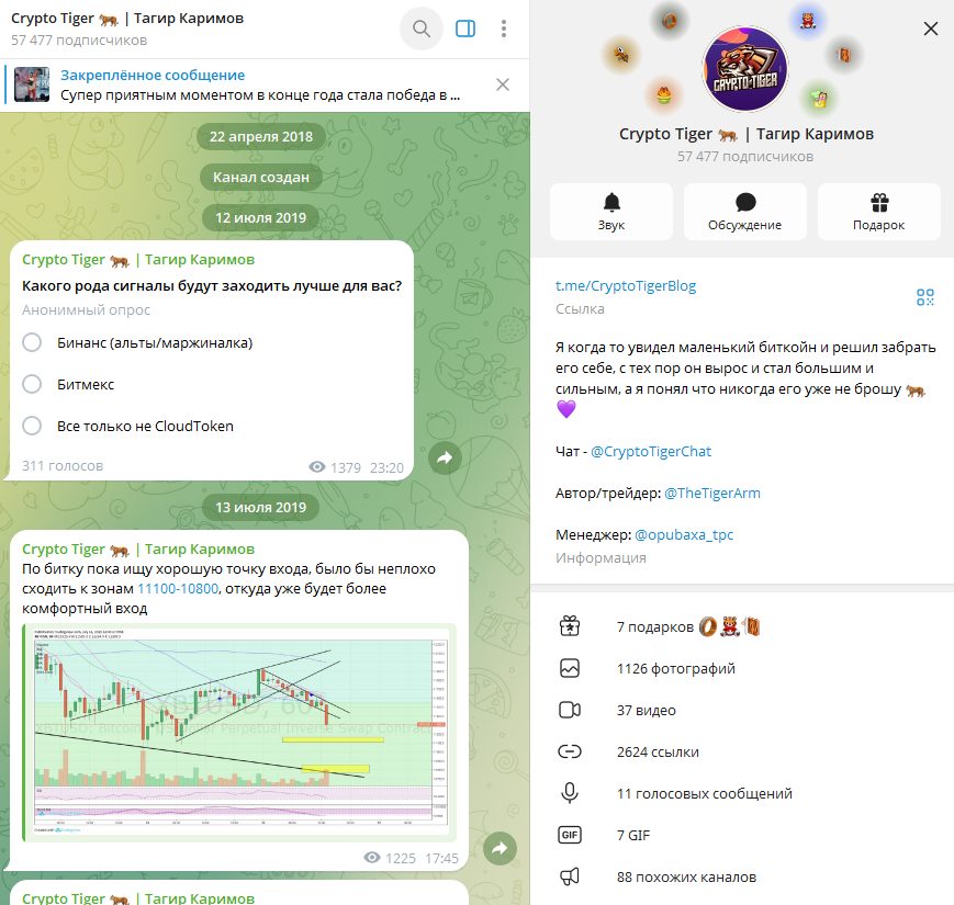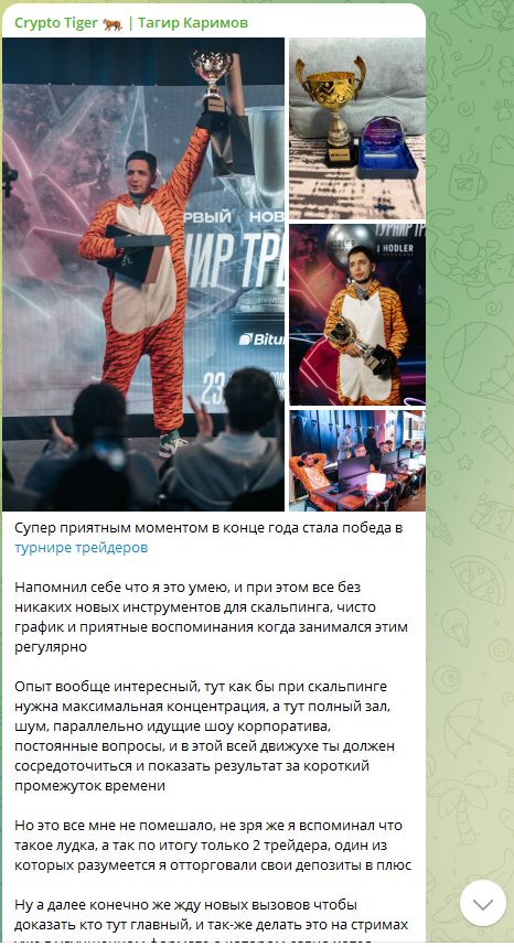 Отметим, что хотя Тагир и рассказывает о своих заслугах на канале cryptotigerblog, статистика отсутствует. Реальных подтверждений успехов в торговле не приводится.