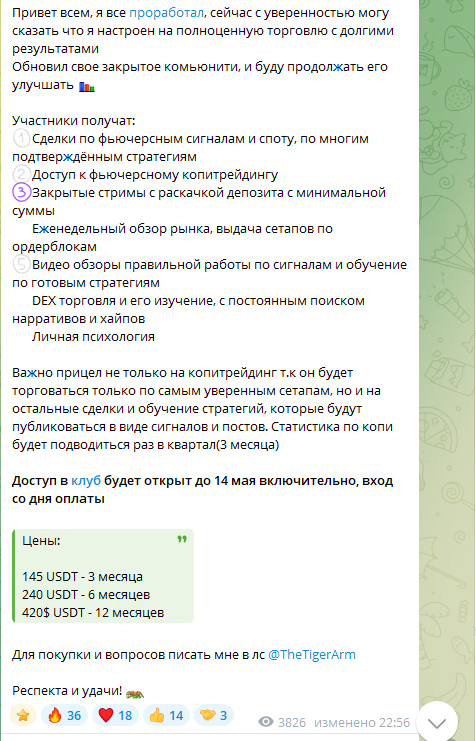 Из платных услуг автор предоставляет доступ в закрытый ВИП-чат. Чем на более длительный срок оформляется подписка, тем более низкая стоимость за месяц получается. Пользователям предлагают оформить подписку на 3 месяца за 145 USDT, на полгода за 240 USDT или за 420 USDT на целый год.