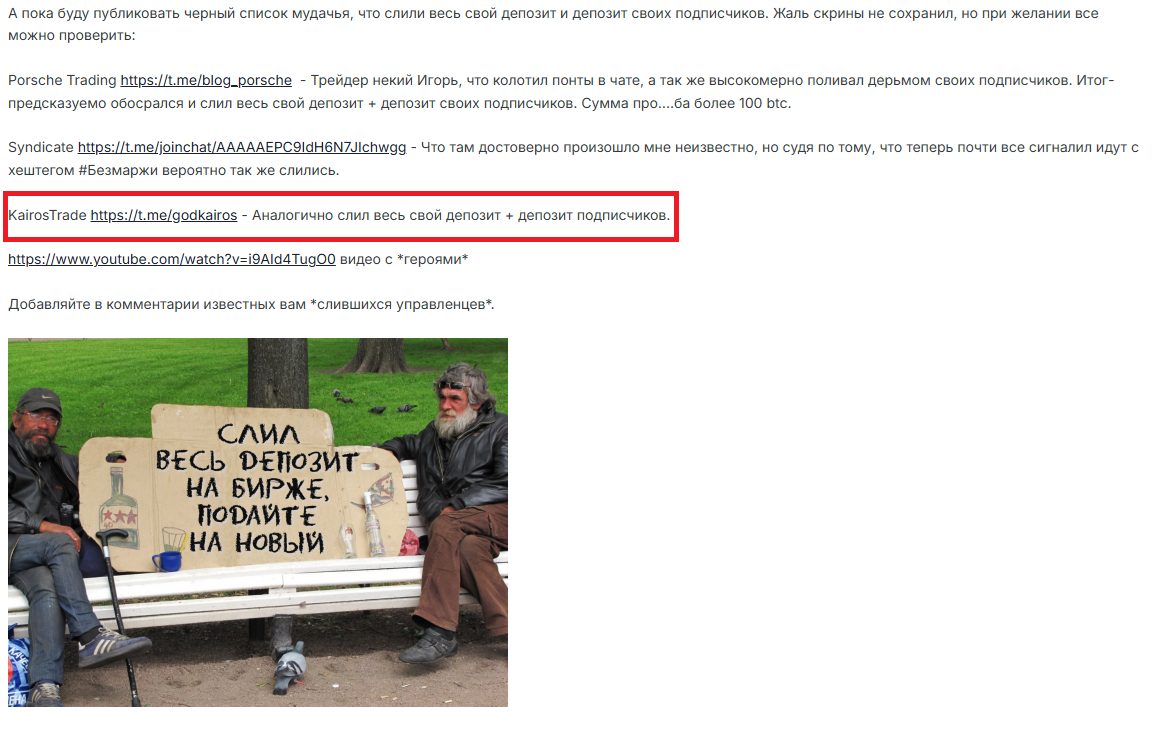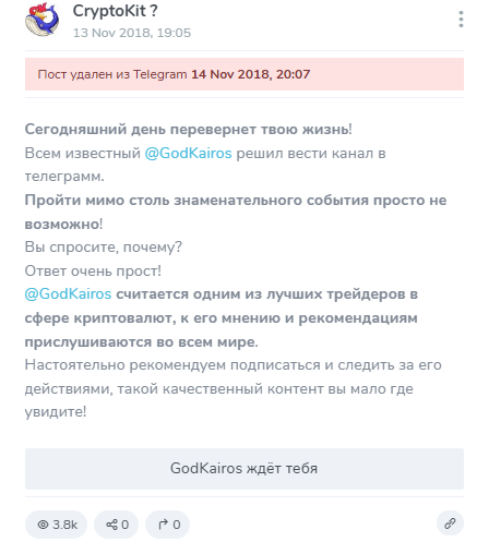 Неизвестно, было ли сообщество выкуплено у данного трейдера, или же GodKairos – прежний псевдоним Тагира. Упоминаний о KairosTrade в сети не так много, в основном они сохранились в сомнительных рекламных объявлениях: