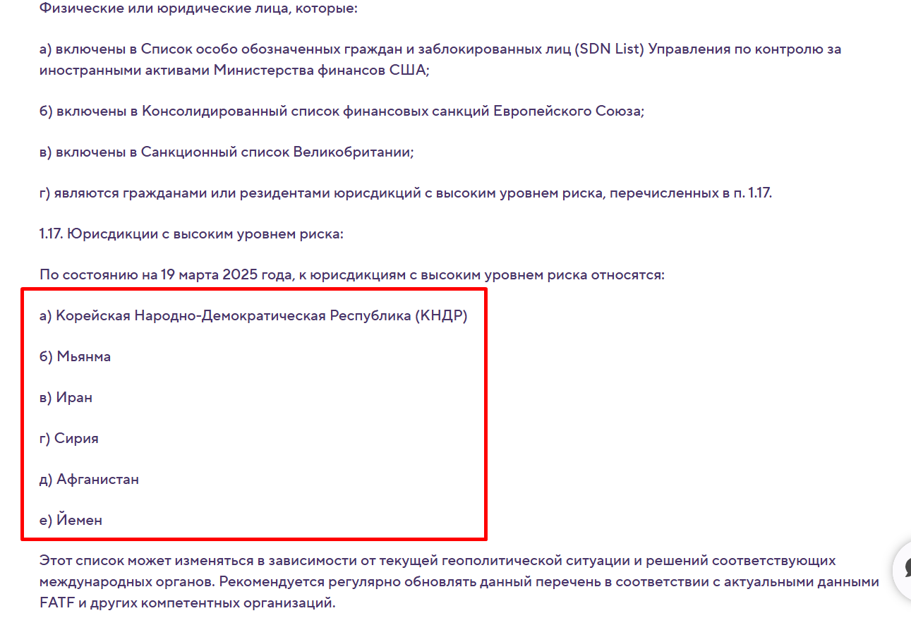Некоторым клиентам компания услуги предоставлять отказывается. К примеру, резидентам стран “с высоким уровнем риска” – Мьянма, Иран, КНДР и другие.