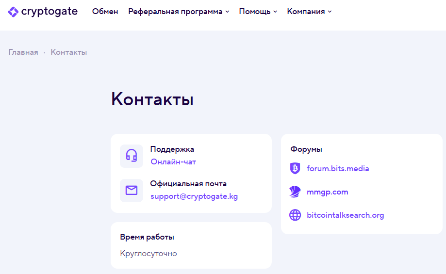 Техподдержка работает через форму обратной связи, Telegram аккаунт – @ cryptogate support, и электронную почту – support @ cryptogate kg.