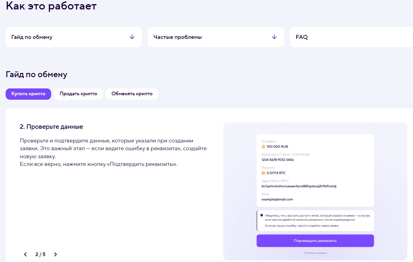 Для новых клиентов представлен гайд по обмену, а также примеры часто возникающих или возможных проблем.