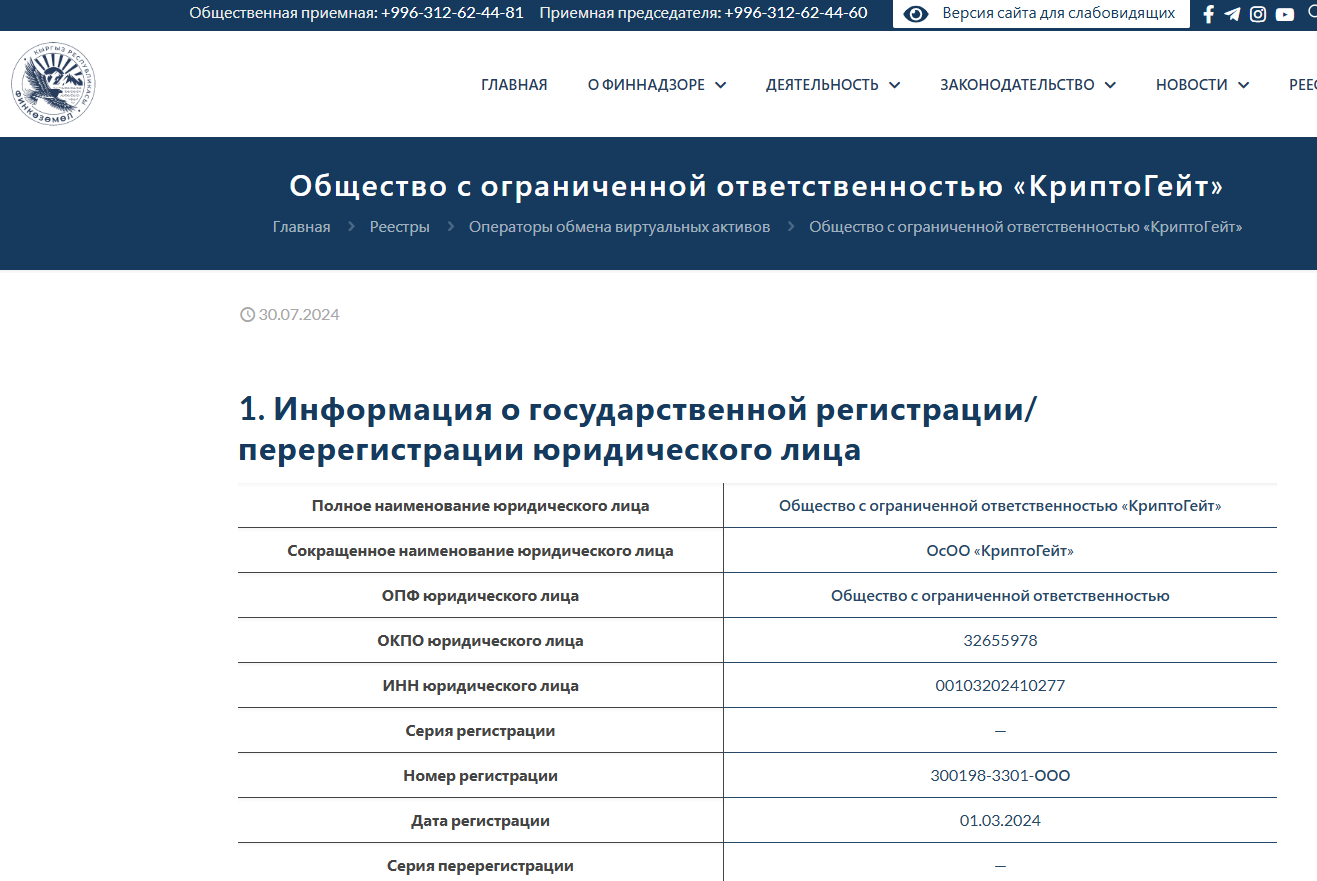 На сайте госслужбы регулирования и надзора за финансовым рынком в Кыргызстана есть информация о регистрации юрлица ООО КриптоГейт от 1 марта 2024 года. Лицензия на деятельность в качестве оператора обмена виртуальных активов получена 9 апреля 2024 года, является бессрочной. Руководитель проекта – Талканбаев Миррад Аттокурович.