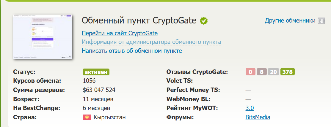 CryptoGate представлен на мониторинге Bestchange, общий возраст проекта составляет 11 месяцев.
